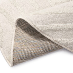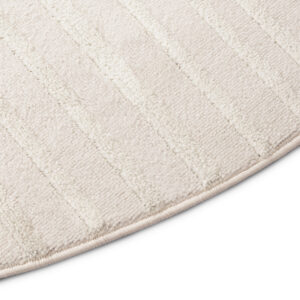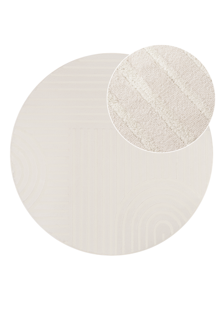 Covorul rotund din colecția Hygge este un element decorativ deosebit, care aduce în interior liniște, lejeritate și confort. Realizat dintr-un amestec de polipropilenă (55%) și poliester (45%), îmbină durabilitatea cu finețea la atingere. Firele sale cu două niveluri, cu o înălțime de până la 18 mm, formează un model geometric cu arcuri și linii delicate, care reflectă frumos lumina, oferind spațiului un efect elegant și tridimensional.