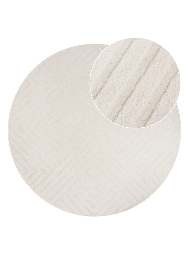 Covorul rotund din colecția Hygge îmbină eleganța subtilă cu minimalismul contemporan. Realizat dintr-un amestec de polipropilenă (55%) și poliester (45%), impresionează prin textura sa moale, durabilitate și strălucire delicată. Firele cu două niveluri, cu o înălțime de până la 18 mm, creează un model geometric bazat pe linii precise și forme simetrice, oferind interiorului o senzație de echilibru și ordine.