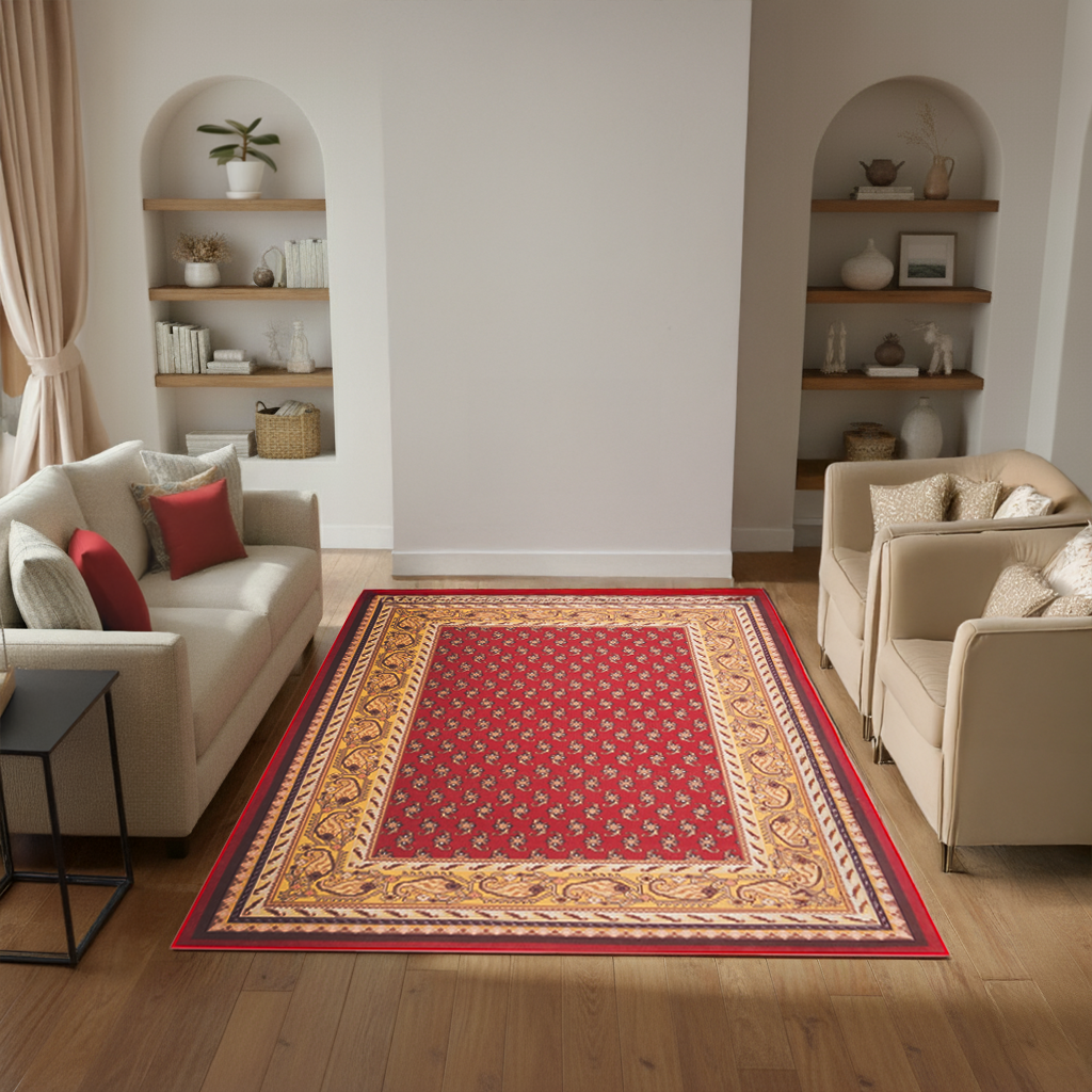 Culori și stil: Roșul intens, combinat cu accente aurii și bej, se potrivește perfect cu mobilierul din lemn, tapițeria bej și accesoriile în tonuri de crem, auriu și negru. Covorul Nora este o alegere excelentă pentru interioare în stil clasic, glamour, vintage sau eclectic.