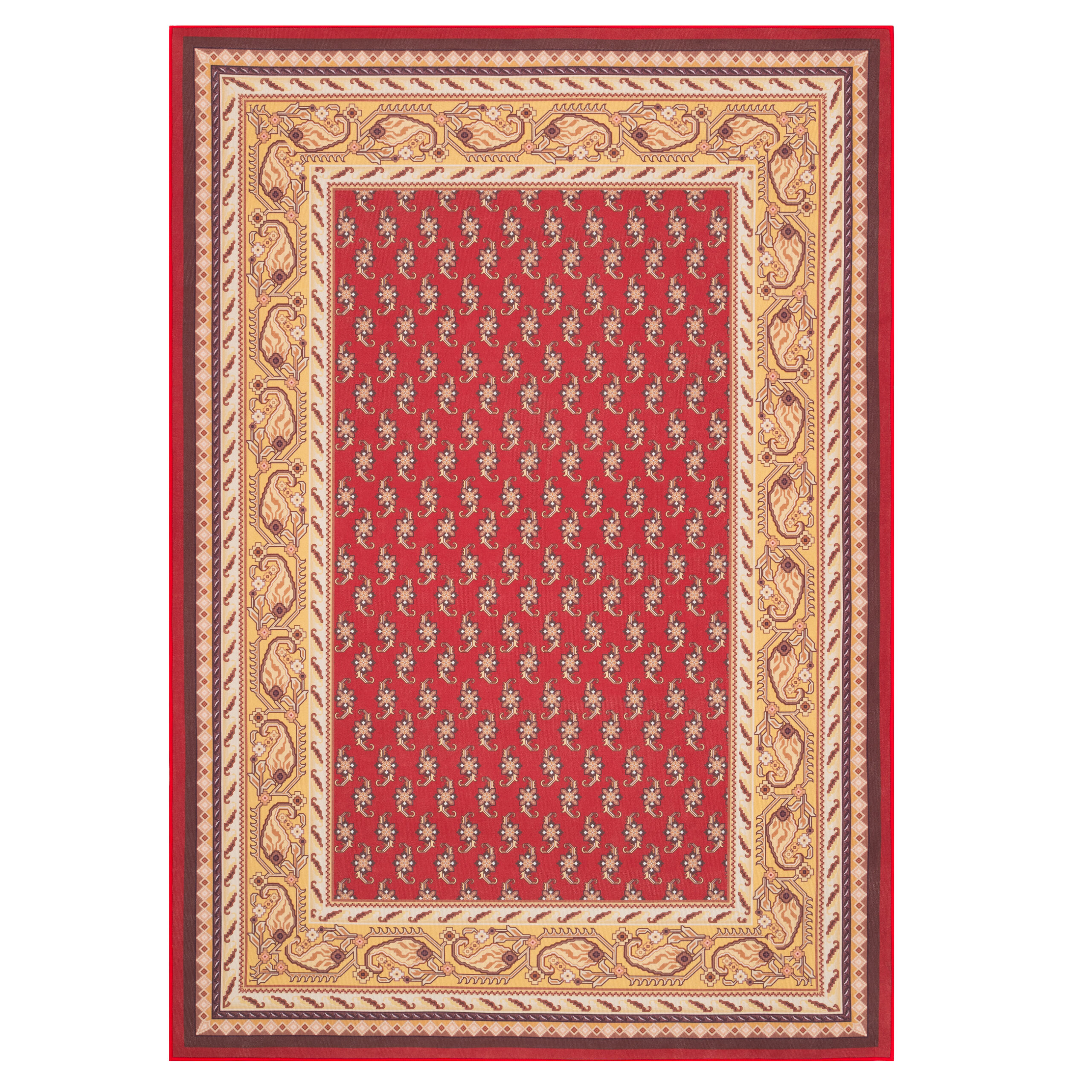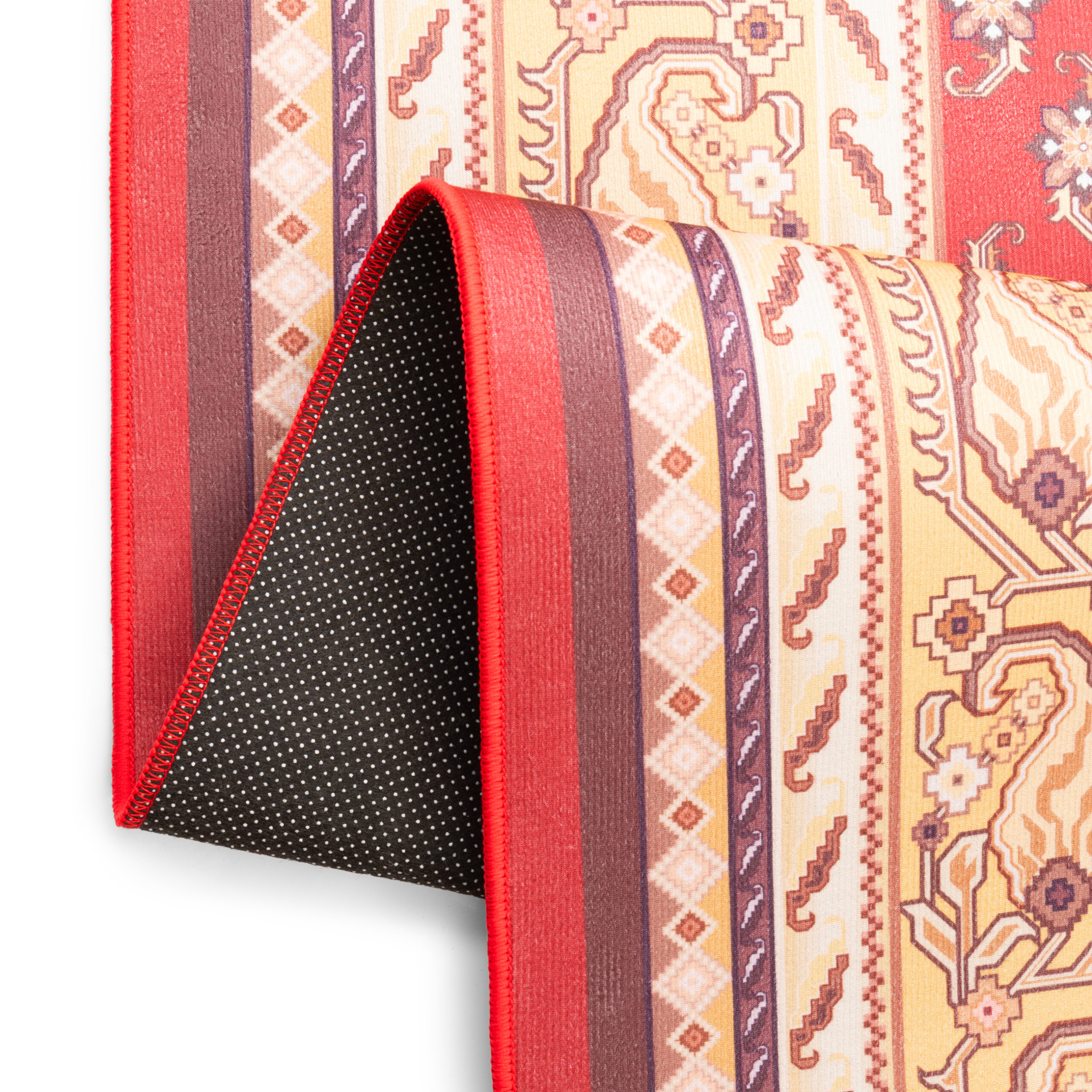 Covorul Nora este alegerea ideală pentru iubitorii stilului atemporal și ai rafinamentului în amenajarea interioarelor. Modelul său imprimat, inspirat de covoarele orientale clasice, îmbină nuanțele profunde de roșu cu o ramă bogat ornamentată în tonuri de auriu, bej și negru, creând o compoziție deosebit de elegantă.