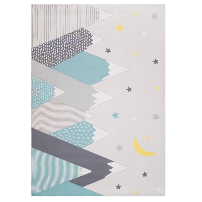 Covorul Joy Mountains se potrivește perfect în camerele copiilor și grădinițelor, mai ales în interioare cu stil scandinav, minimalist sau modern. Paleta sa de culori delicate – alb, gri, albastru deschis, turcoaz și o notă subtilă de galben – se combină minunat cu mobilierul deschis la culoare sau din lemn, creând un spațiu plin de căldură și liniște.