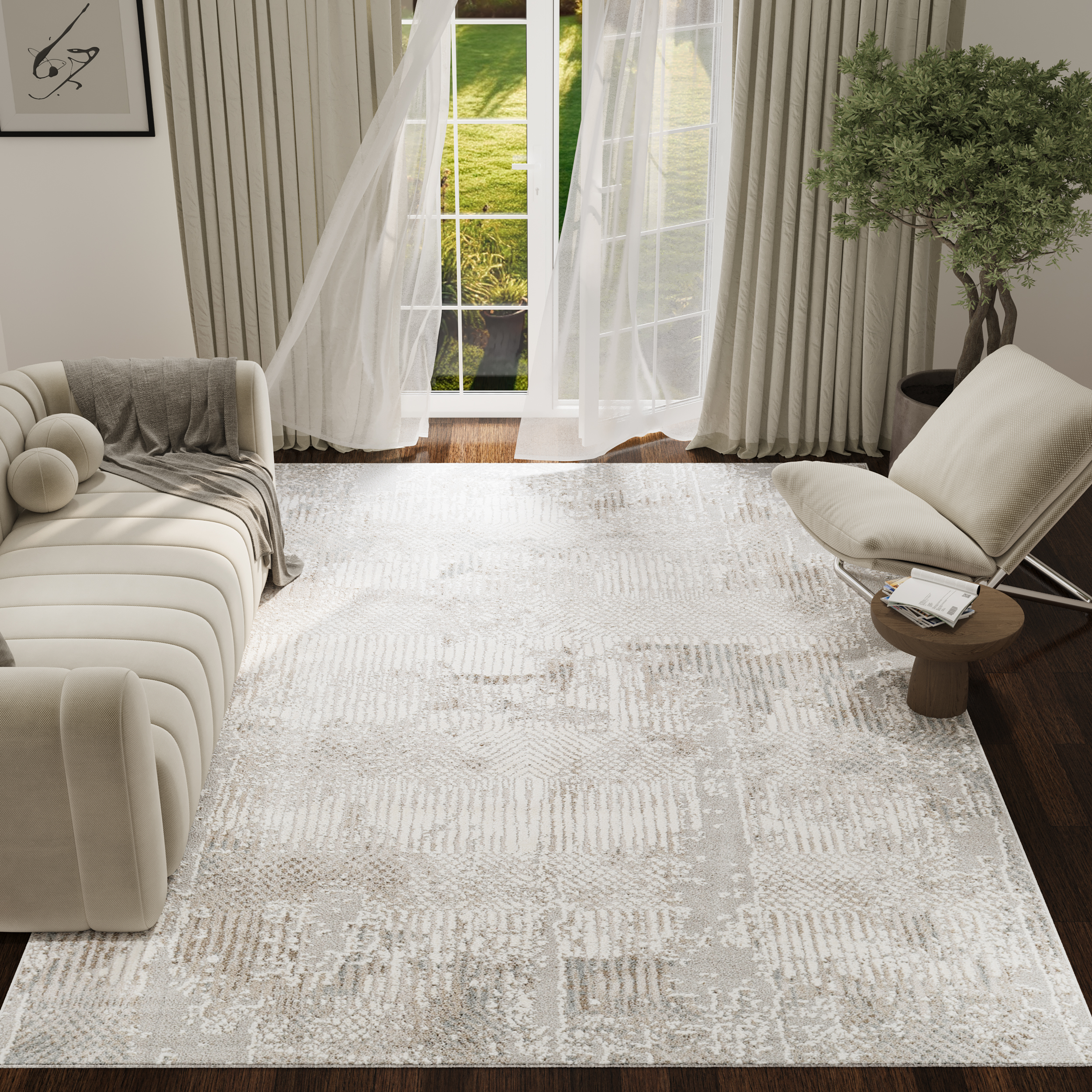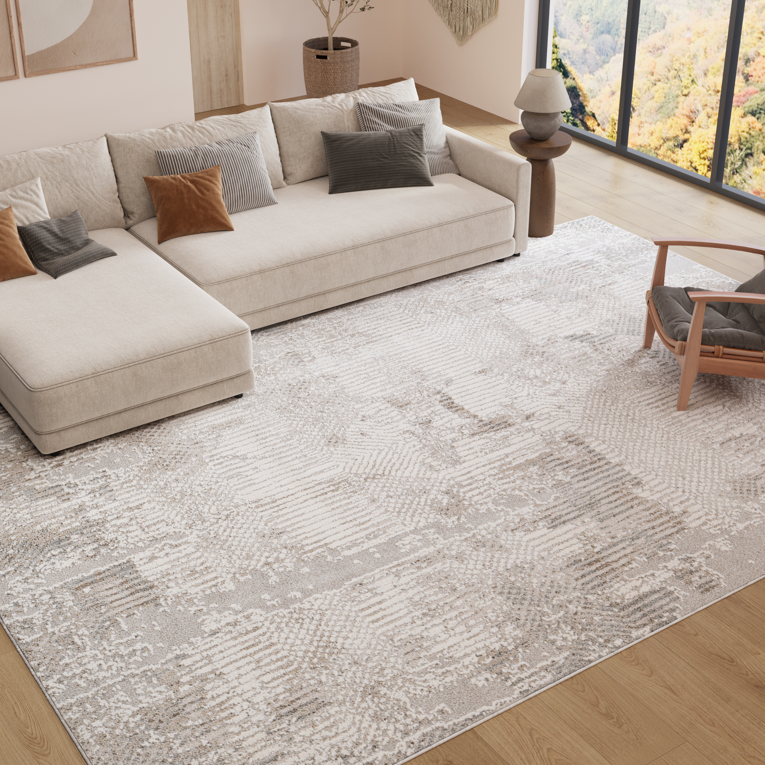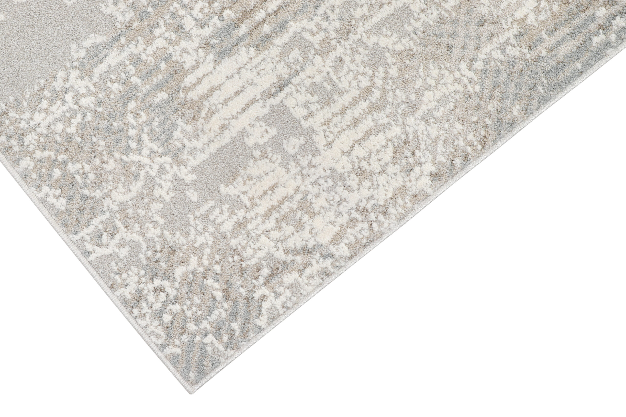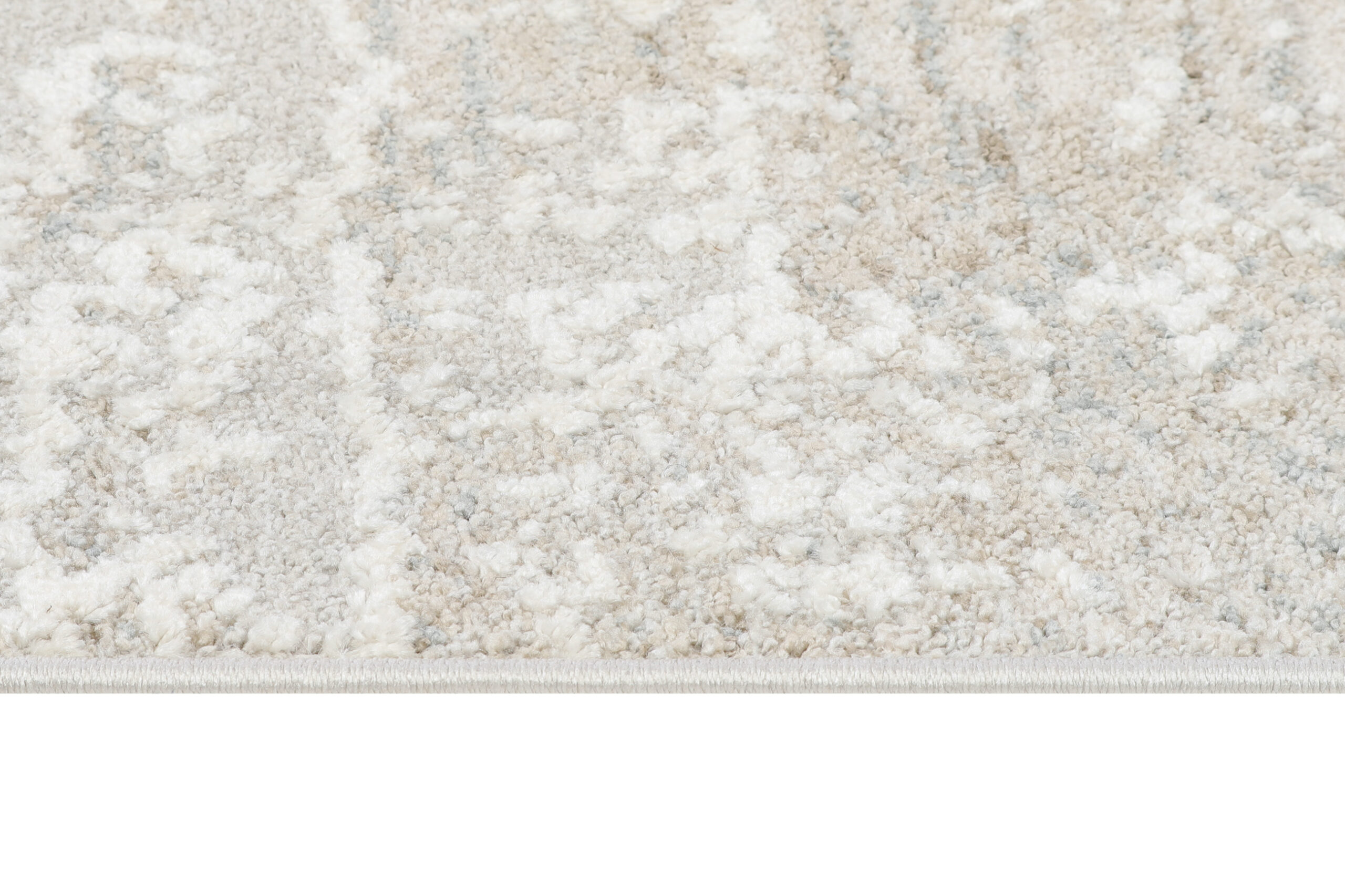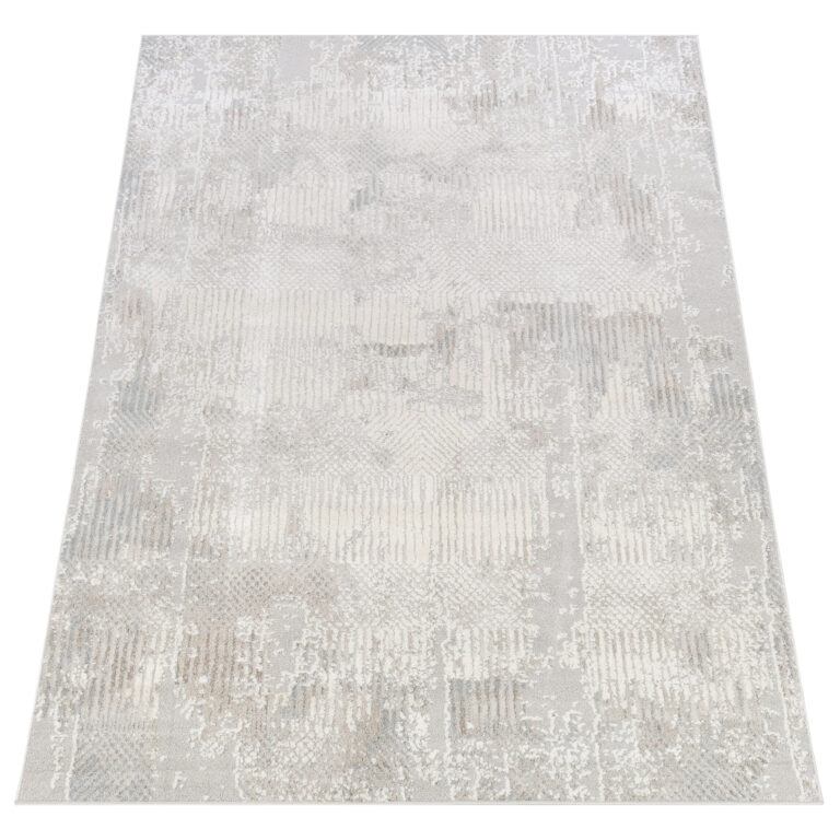 Stil și Amenajare: Acest covor se potrivește perfect în interioare clasice, scandinave, minimaliste sau glamour. Paleta sa de culori neutre, bazată pe nuanțe de bej și gri, se armonizează excelent cu mobilierul deschis la culoare, lemnul natural și accesoriile în tonuri de alb, auriu sau argintiu.